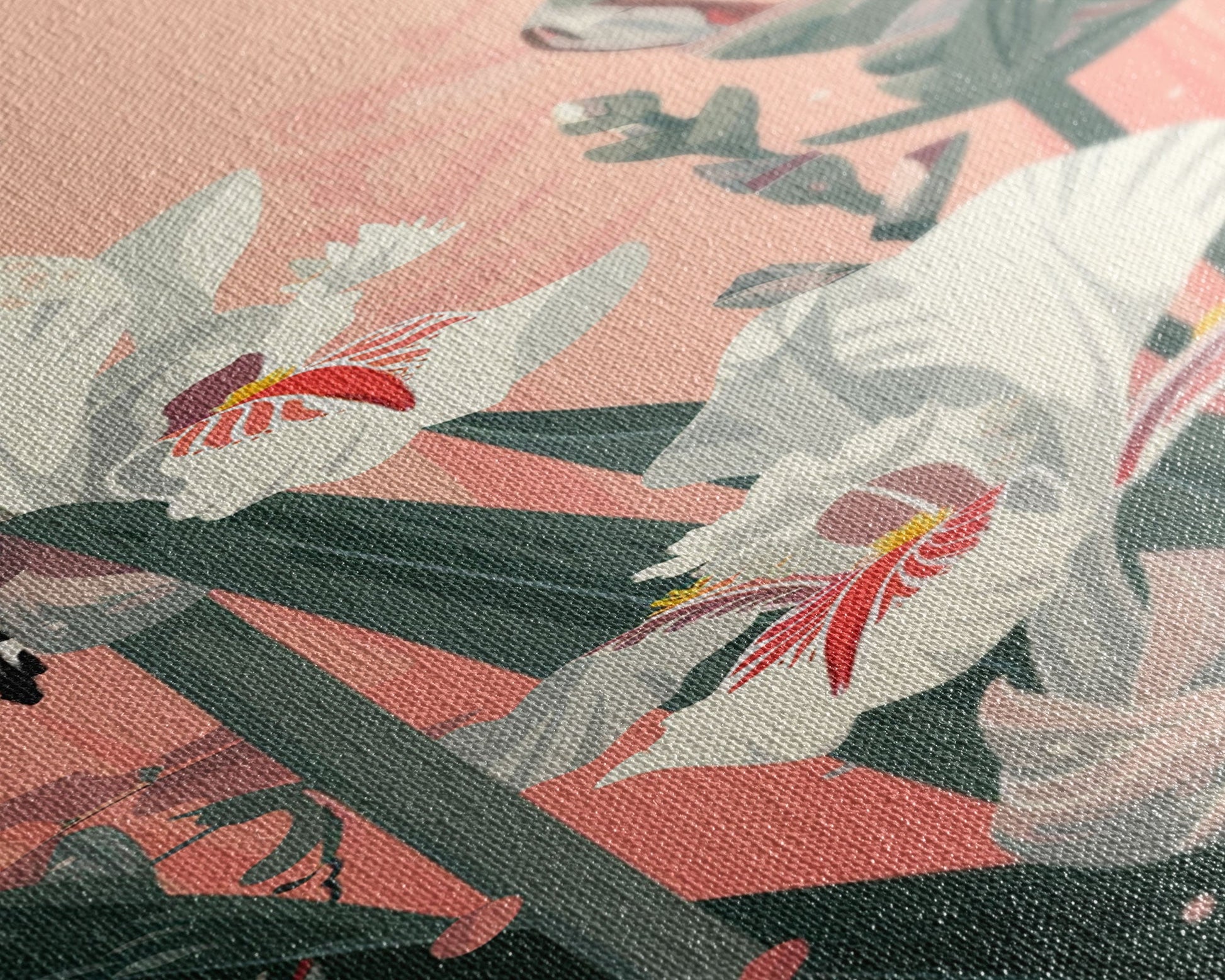 Woodpecker Perched on Stalks of Flowers against a Soft Pink Background Ukiyo-e Art Japanese Framed Canvas Print Skinny Tall Art